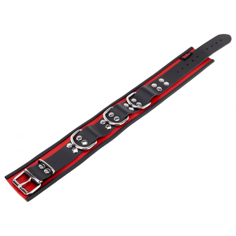 Collier avec anneaux en Dcuirrouge-noir de The RED. Ce collier en cuir est également disponible dans d'autres couleurs originales. La sangle de la boucle de fermeture est solidement rivetée au collier et est livrée avec une boucle à rouleau argentée pour le réglage à la taille requise.