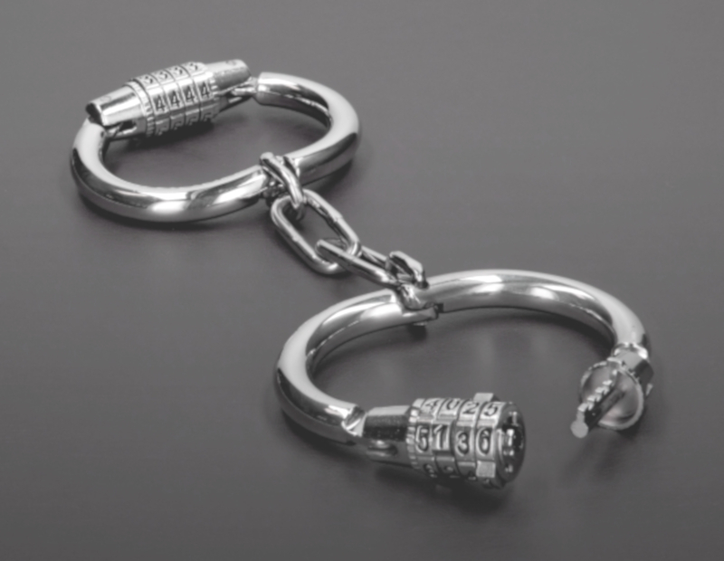 L'acier inoxydable poli et brillant ne rouille pas et est facile à nettoyer. Les menottes sont reliées par une chaîne et peuvent être fermées à l'aide de la charnière et des deux serrures à combinaison.