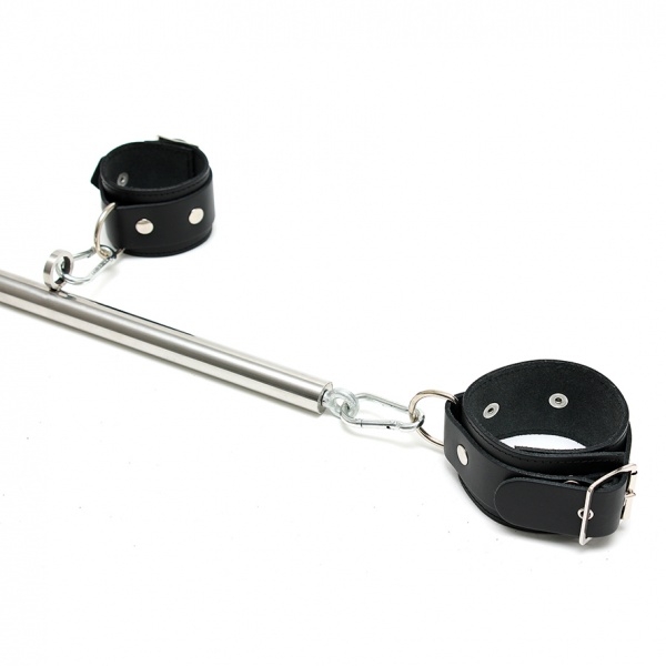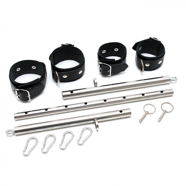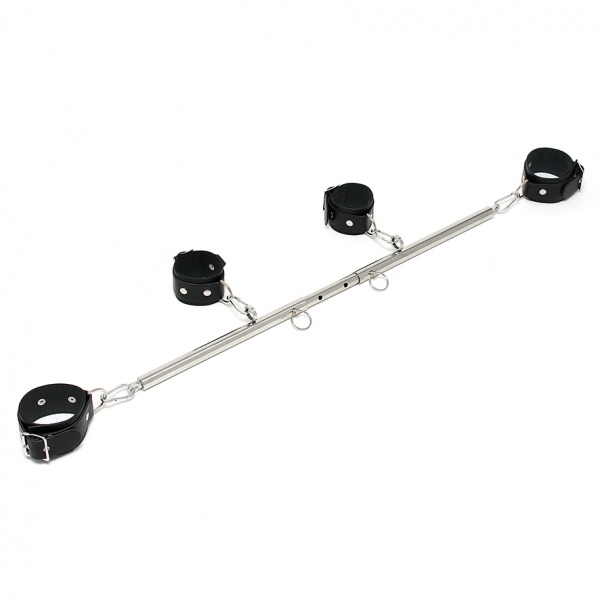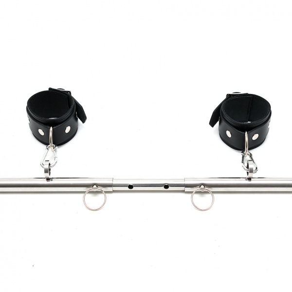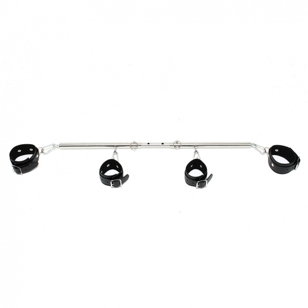 Bondage combination with a chrome spreader-bar, over 8 positions adjustable from 55 to 85 cm width, comes with black, strong and smooth saddle leather wrist and anklerestraints. The wrist and ankle restraints with D-rings can be attached to the strong eyelets of the spreader-bar with the included snap-hooks.