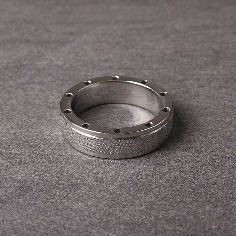 Cock ring stainless steel industrial design 50mm by Shots Steel / Triune. Made from massive, gloss-polished stainless steel comes this penis ring with industrial design with knurl, ribs and holes.