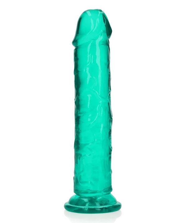 Dildo mit Saugfuss "Realistic Dong 9-Inch" türkis von RealRock by Shots. Dieser transparente, stattlich grosse Dildo aus der Crystal-Clear Serie ist für vaginale oder auch anale Verwendung konzipiert.
