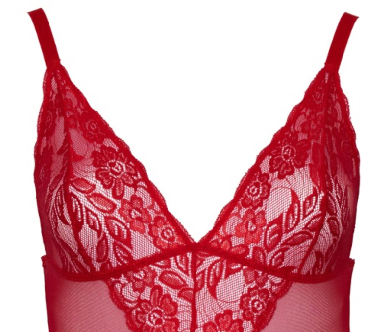 BodyouvertNetz & Spitzegrosse Grössenrot von Cottelli Curves. Dies ist ein rot-transparenter, schrittoffener Body aus feinem, elastischem Powernetz-Stoff mit Soft-Cups und Einsätzen aus zarter Spitze.