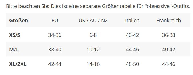 Dieses Bodystocking hat einen tiefen Ausschnitt und ist auch über die Schulter gestreift tragbar. Die langen Ärmel kommen mit  Fingerschlaufe. Bitte beachten Sie die Obsessive Grössentabelle (Bild).