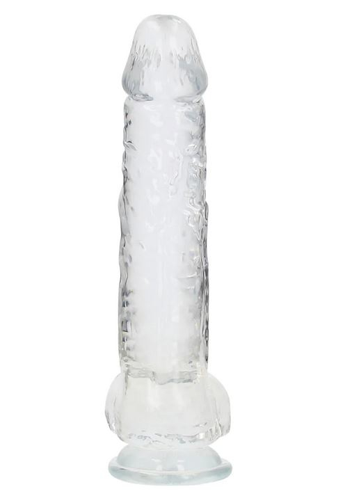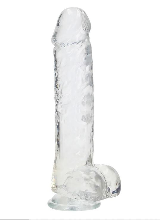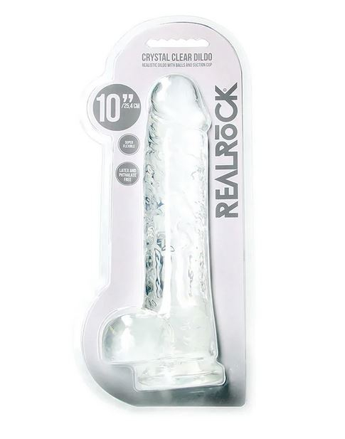 Godemiché avec ventouse "Cock réaliste 10-Inch" transparent de RealRock by Shots. Ce gode transparent de taille imposante de la série Crystal-Clear a été conçu avec des testicules réalistes pour une expérience encore plus réaliste.