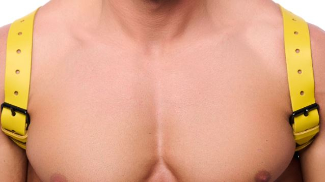 Der Harness ist aus 2 mm starken Lederriemen mit 3.5 cm Breite hergestellt. Die Einstellung auf die perfekte Grösse erfolgt über 2 schwarze Metall-Schnallen vorne an den Armen.